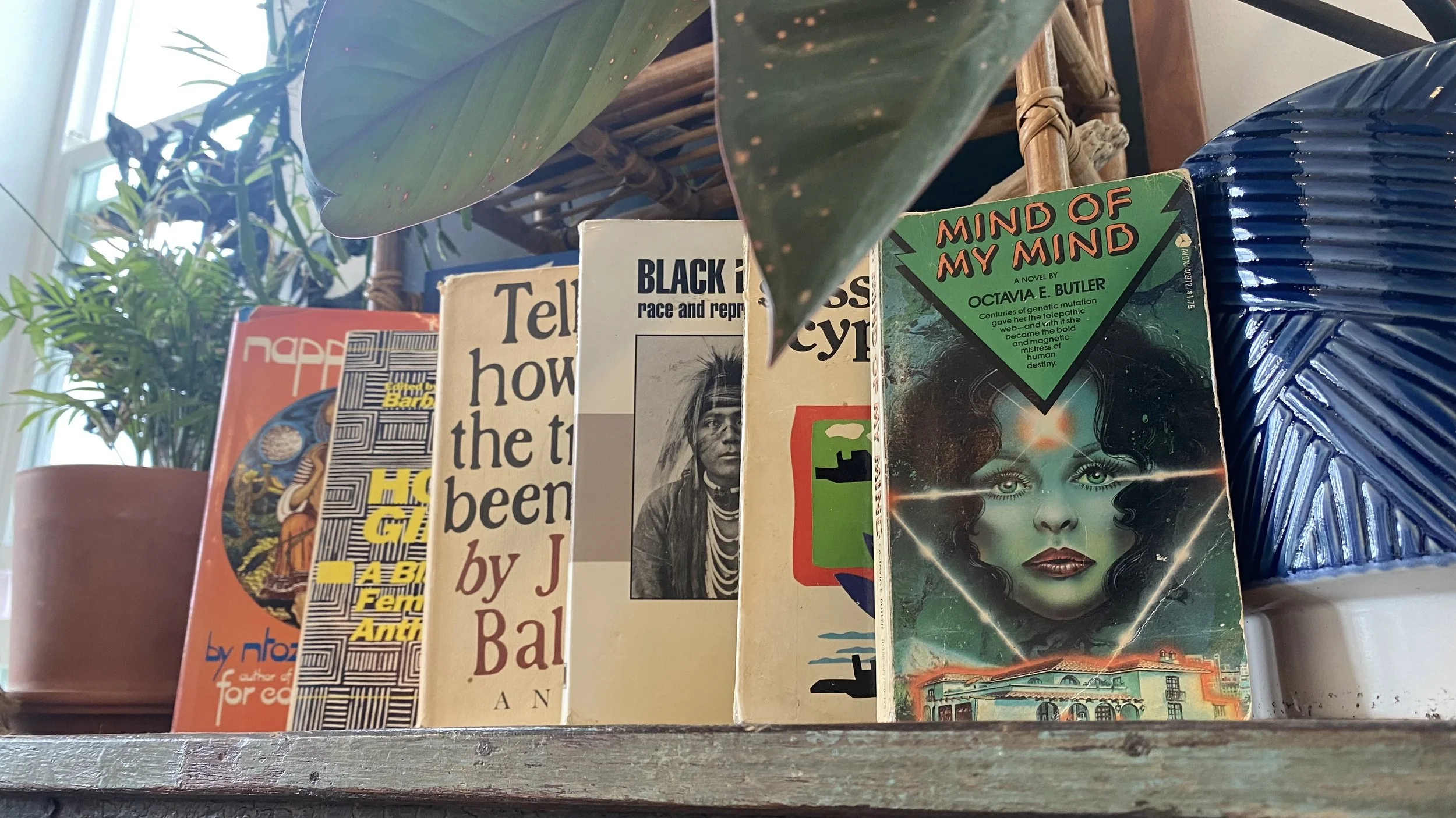 An image of vintage editions of: Nappy Edges - Ntozake Shange | Home Girls - ed. Barbara Smith | Tell Me How Long The Train's Been Gone - James Baldwin | Black Looks: Race & Representation - bell hooks | Sassafras, Cypress & Indigo - Ntozake Shange | Mind of My Mind - Octavia Butler